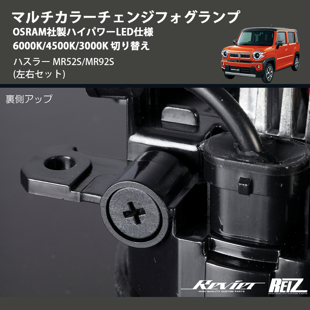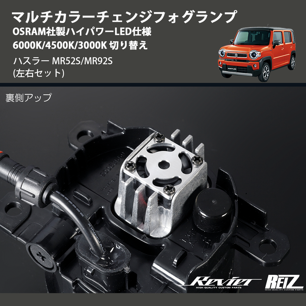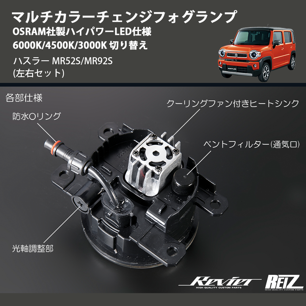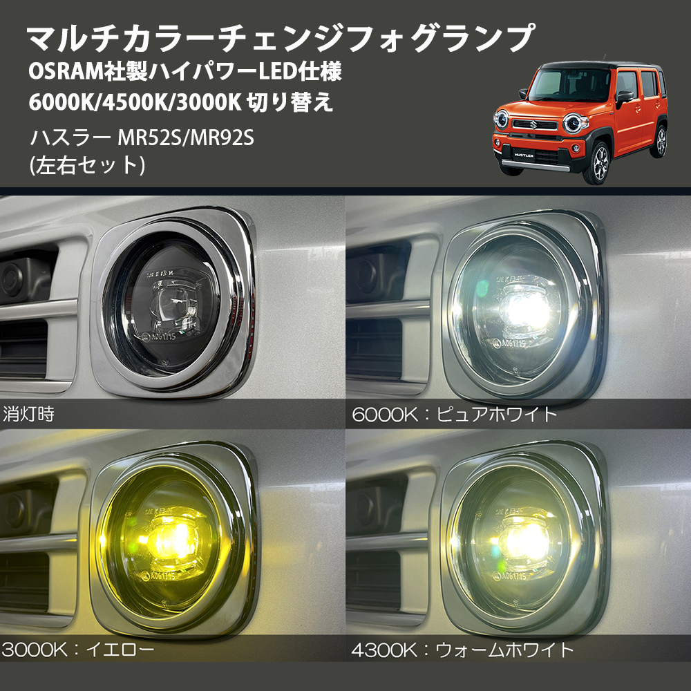 在庫状況により、お届けまでに約2ヶ月ほどお時間をいただく場合がございます。お急ぎの方はお気軽にお問合せください。 【KEYWORD】 ハスラー / MR52S/MR92S / マルチカラーチェンジフォグランプ OSRAM社製ハイパワーLED仕様 6000K/4500K/3000K 切り替え / カスタムパーツ
