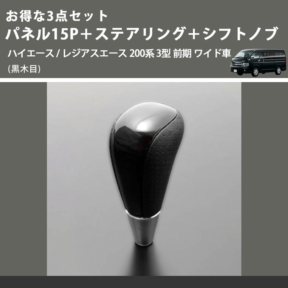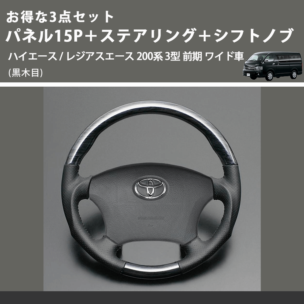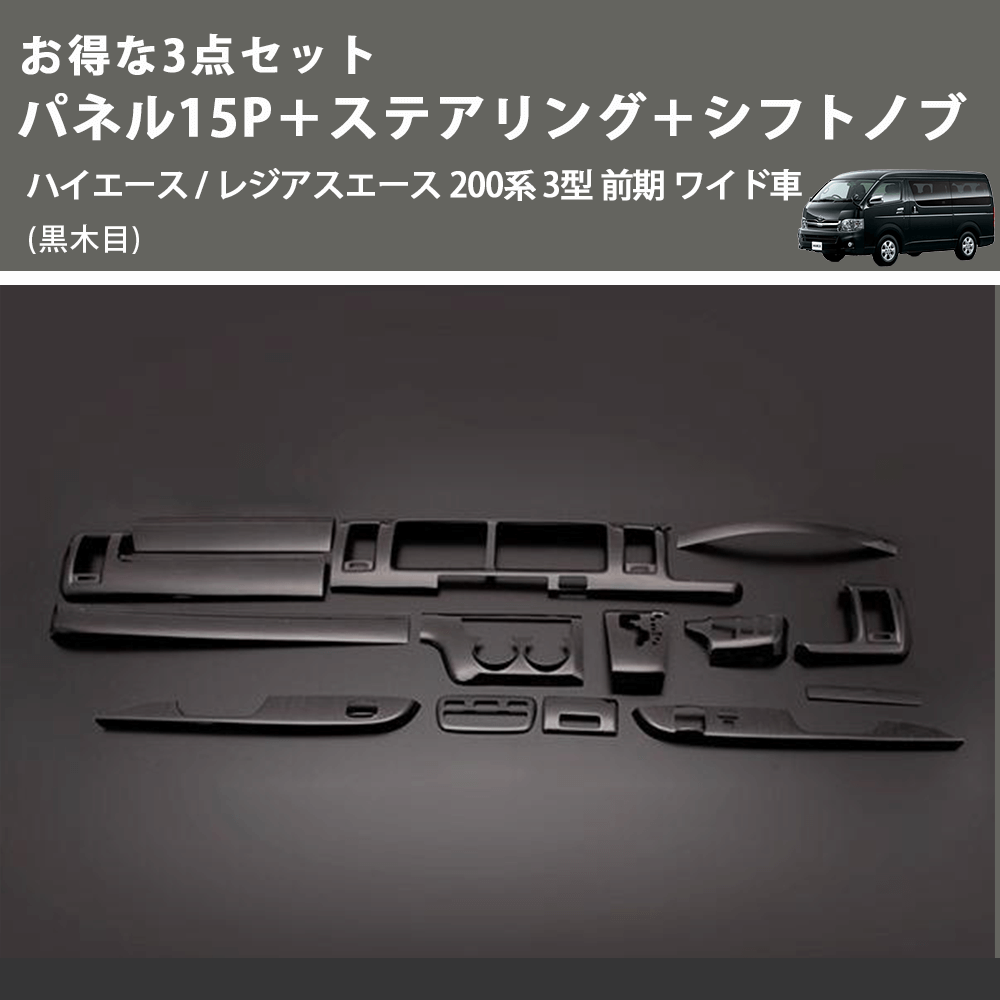 (黒木目) お得な3点セット パネル15P+ステアリング+シフトノブ ハイエース / レジアスエース 200系 3型 前期 ワイド車