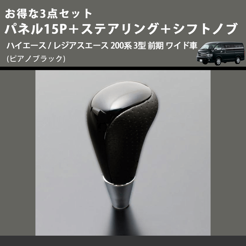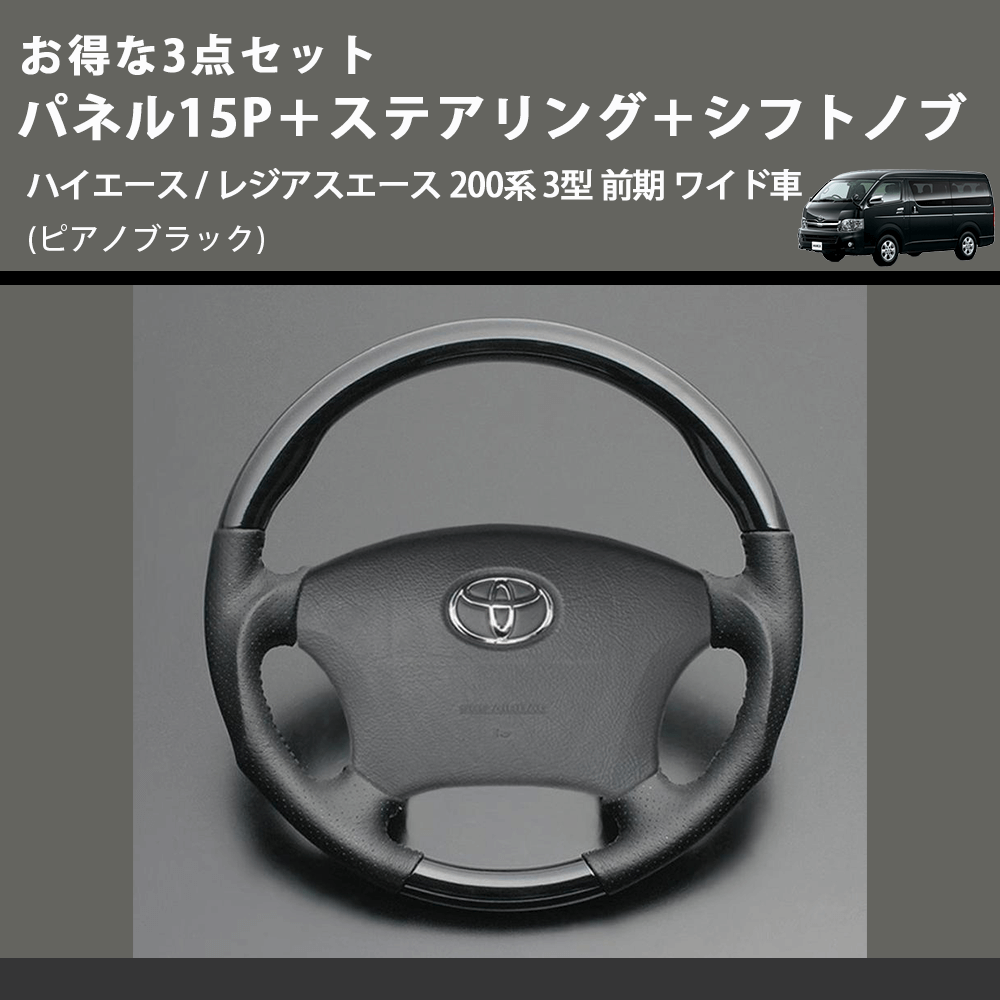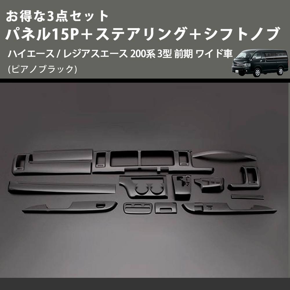 (ピアノブラック) お得な3点セット パネル15P+ステアリング+シフトノブ ハイエース / レジアスエース 200系 3型 前期 ワイド車