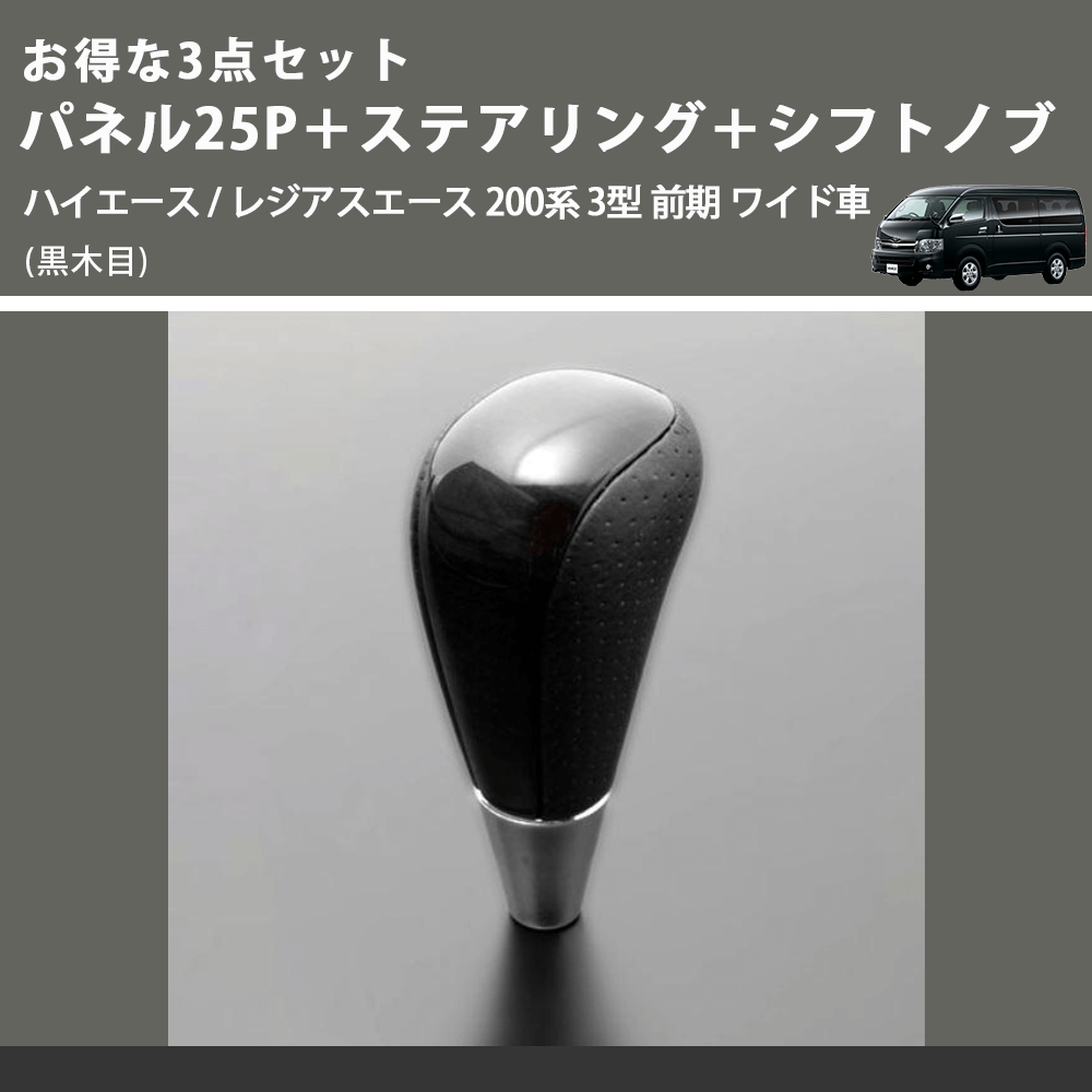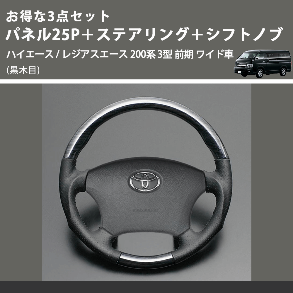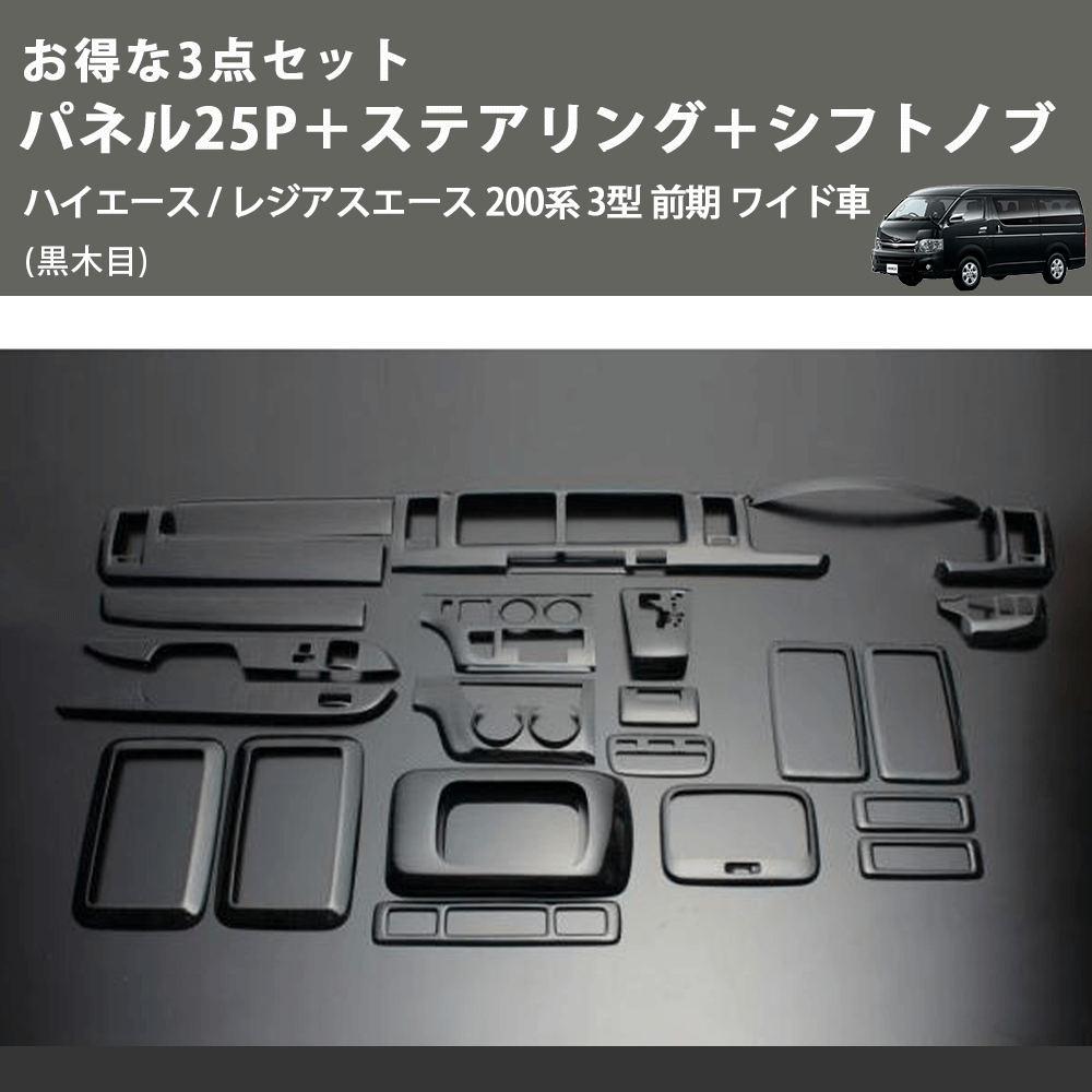 (黒木目) お得な3点セット パネル25P+ステアリング+シフトノブ ハイエース / レジアスエース 200系 3型 前期 ワイド車