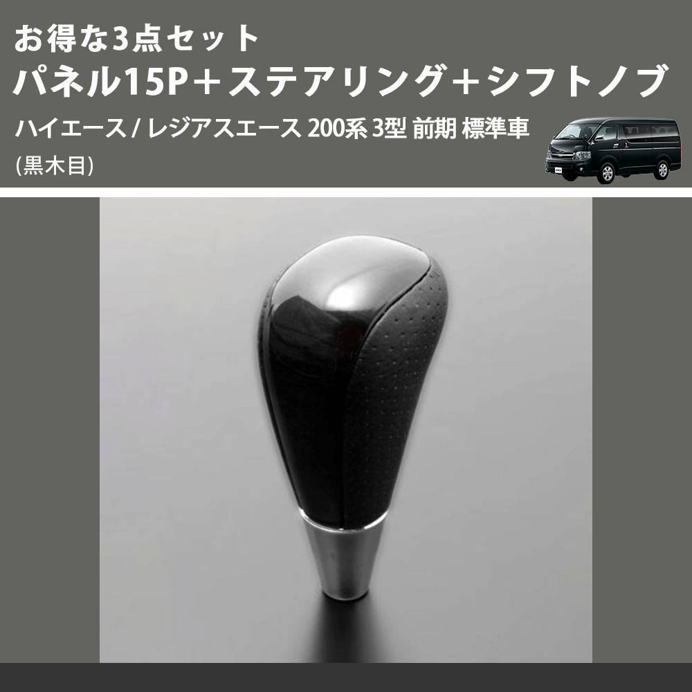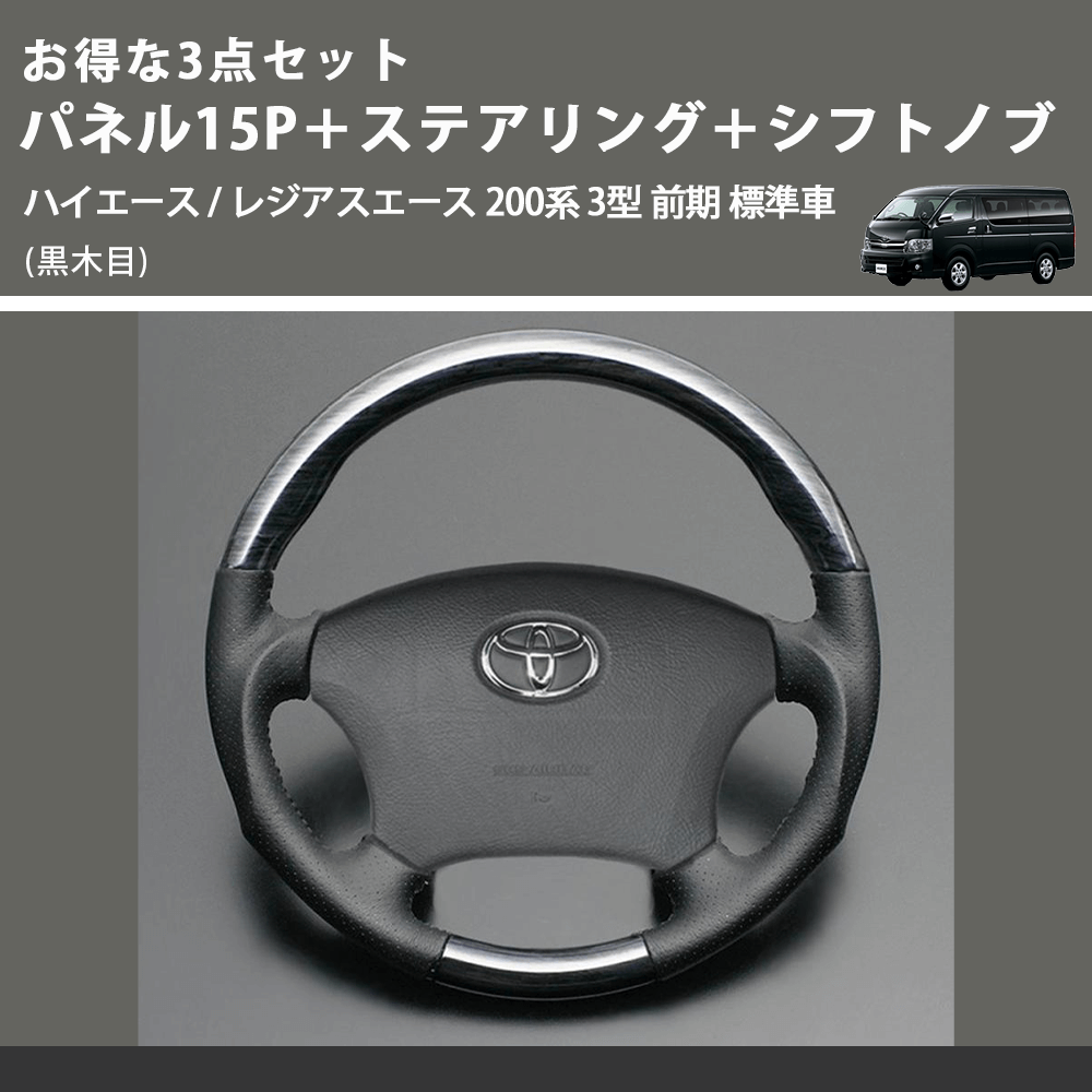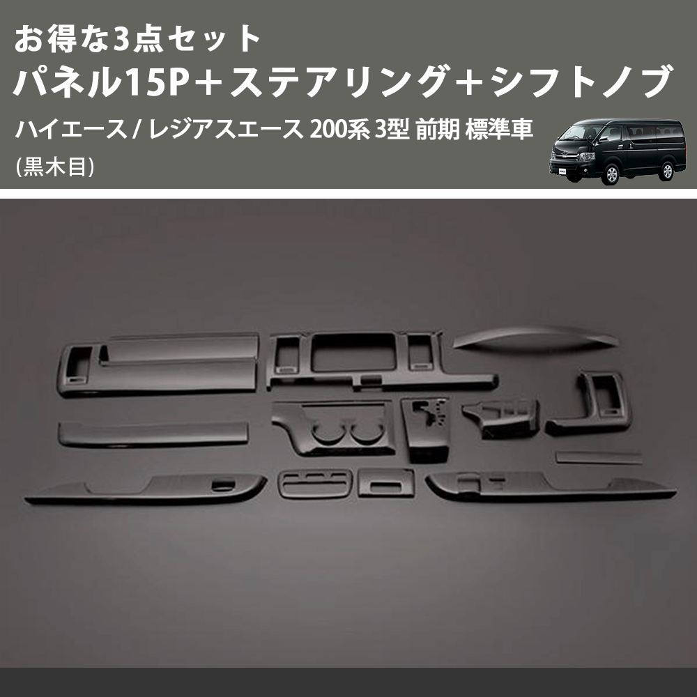 (黒木目) お得な3点セット パネル15P+ステアリング+シフトノブ ハイエース / レジアスエース 200系 3型 前期 標準車
