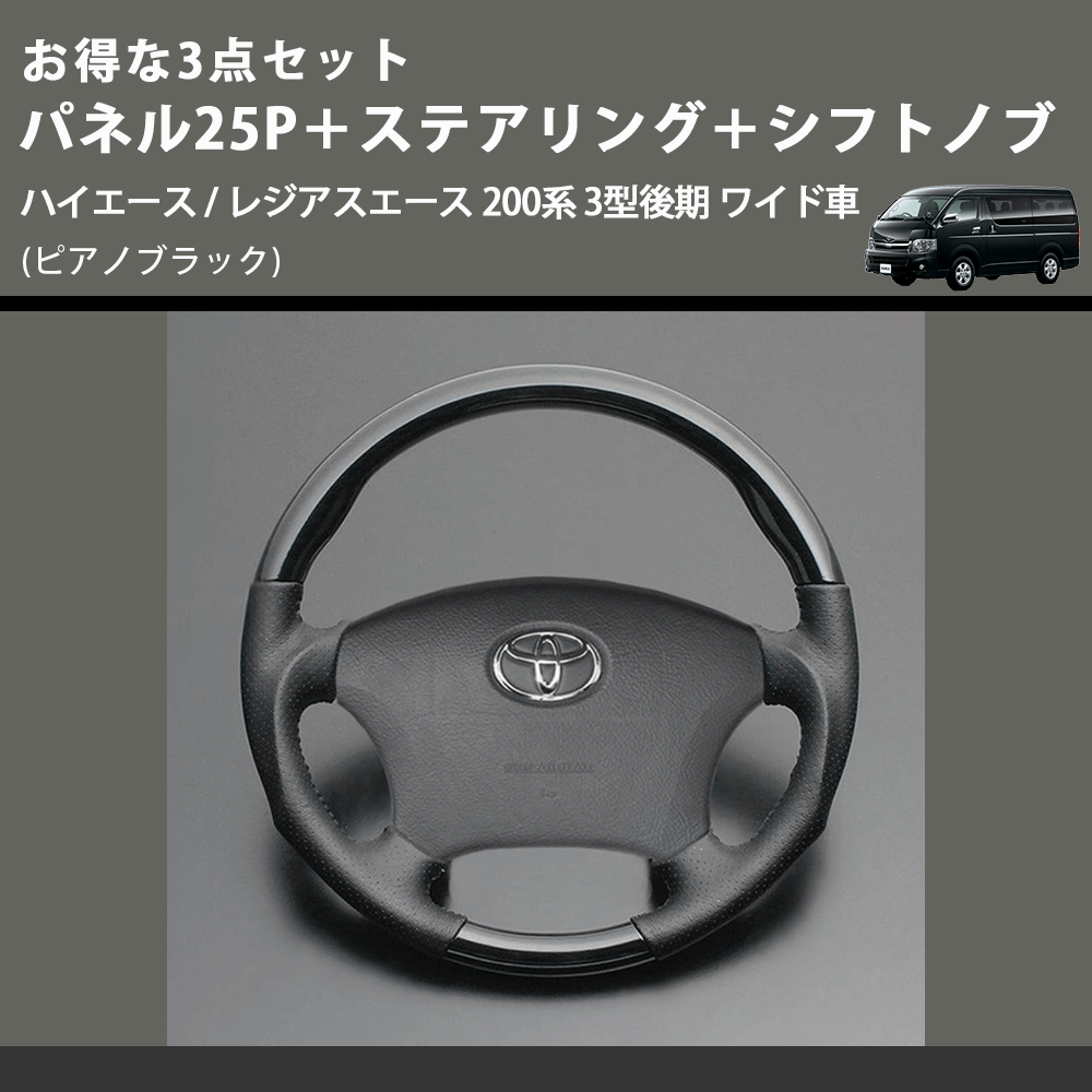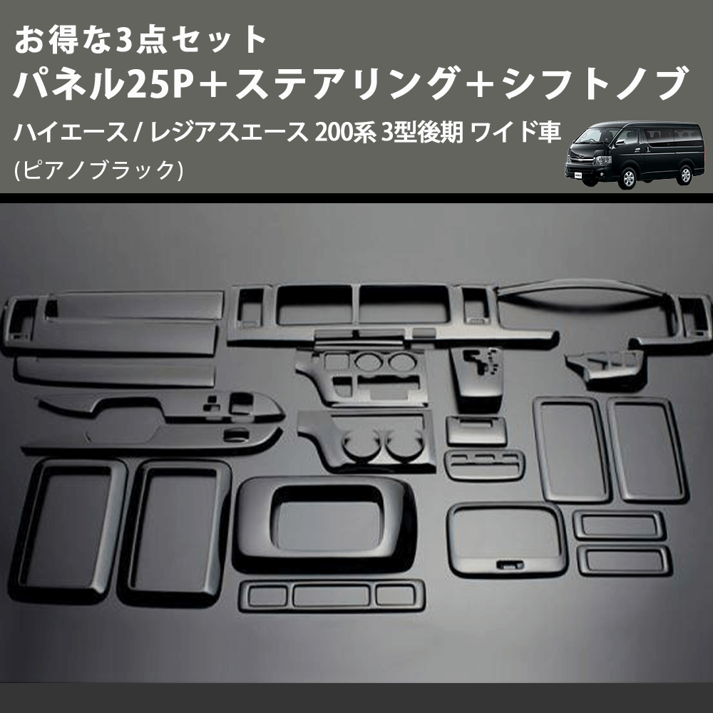 (ピアノブラック) お得な3点セット パネル25P+ステアリング+シフトノブ ハイエース / レジアスエース 200系 3型後期 ワイド車