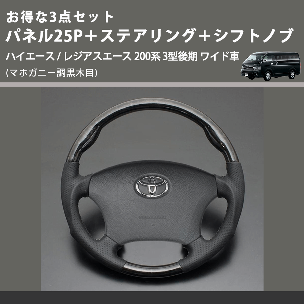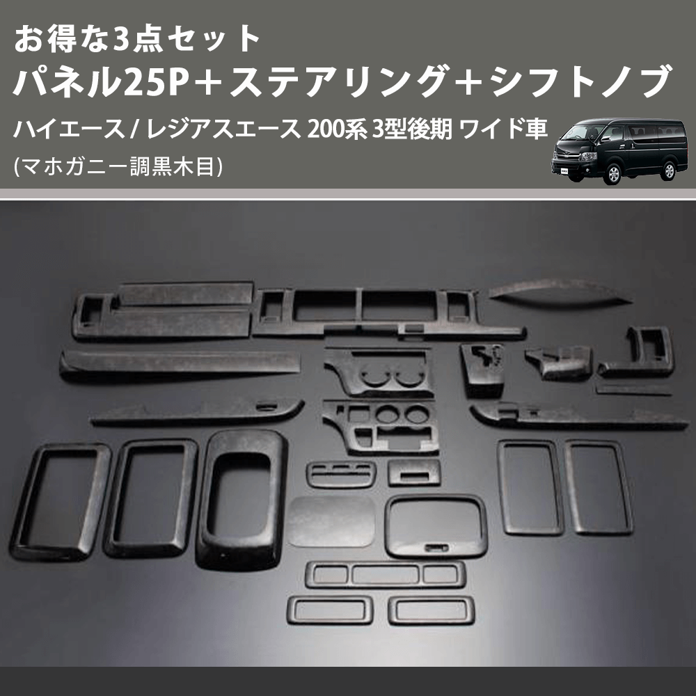 (マホガニー調黒木目) お得な3点セット パネル25P+ステアリング+シフトノブ ハイエース / レジアスエース 200系 3型後期 ワイド車