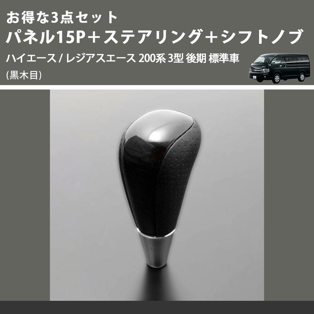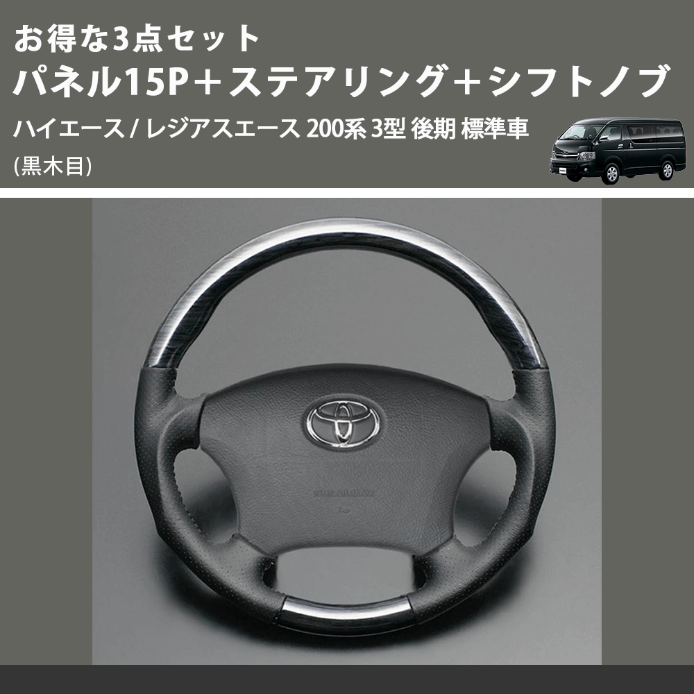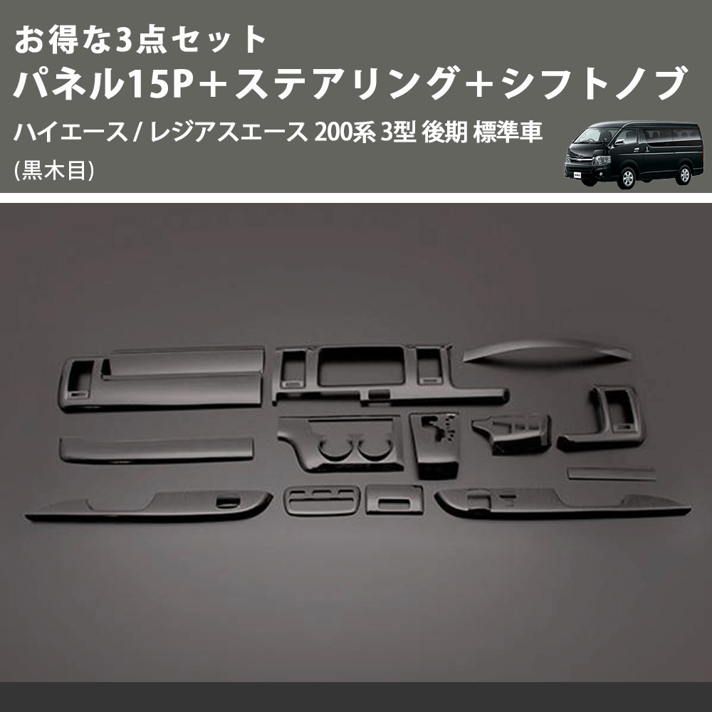 (黒木目) お得な3点セット パネル15P+ステアリング+シフトノブ ハイエース / レジアスエース 200系 3型 後期 標準車
