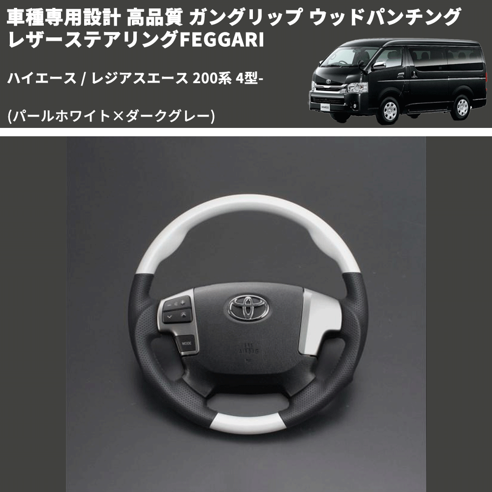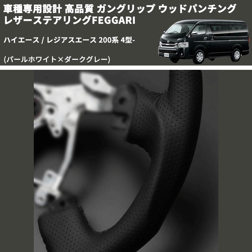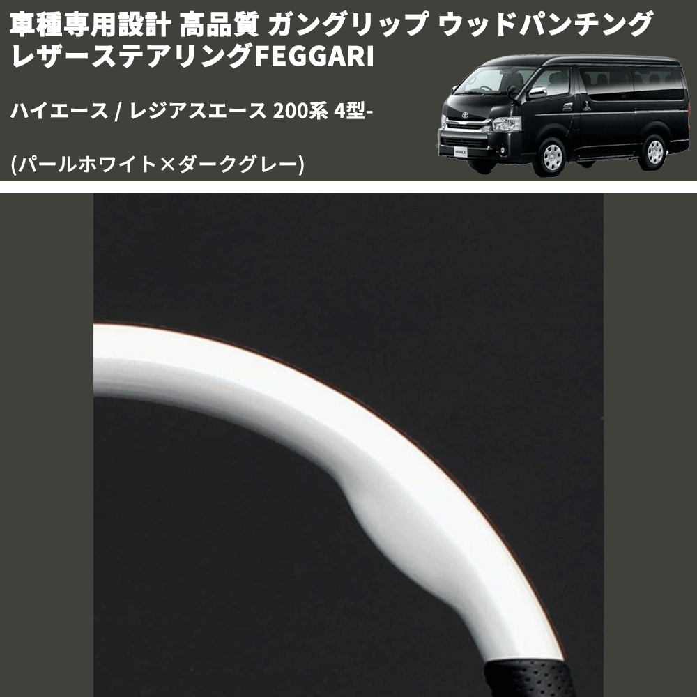 (パールホワイト×ダークグレー) ガングリップ ウッド×パンチング 本皮調 レザーステアリング ハイエース 200系 4型- FEGGARI LS143-251-001