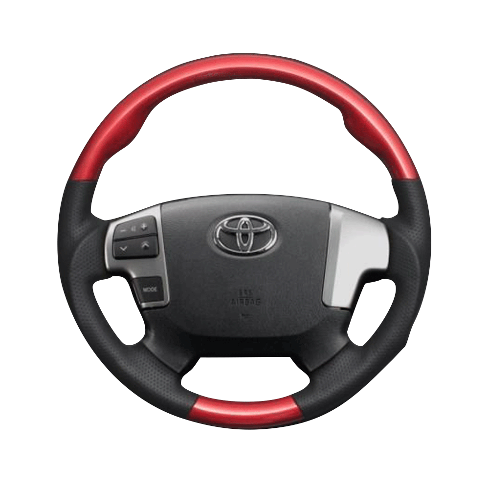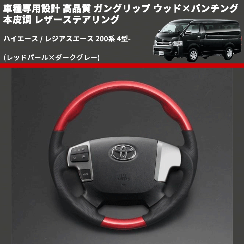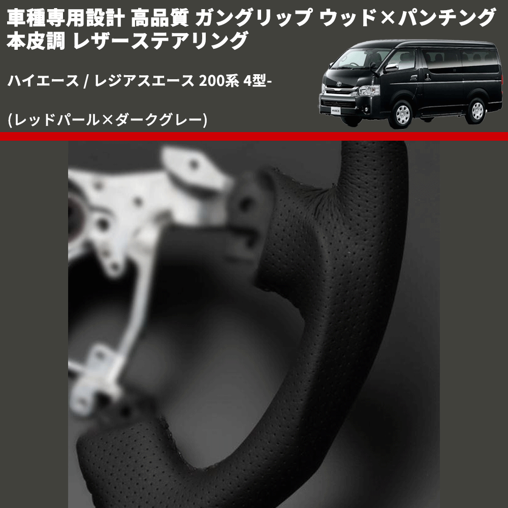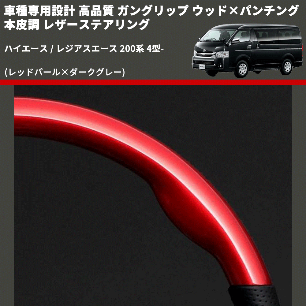 (レッドパール×ダークグレー) ガングリップ ウッド×パンチング 本皮調 レザーステアリング ハイエース / レジアスエース 200系 4型- FEGGARI LSH4-RED-001