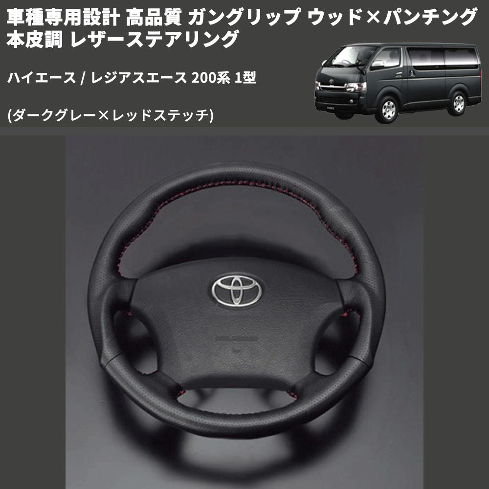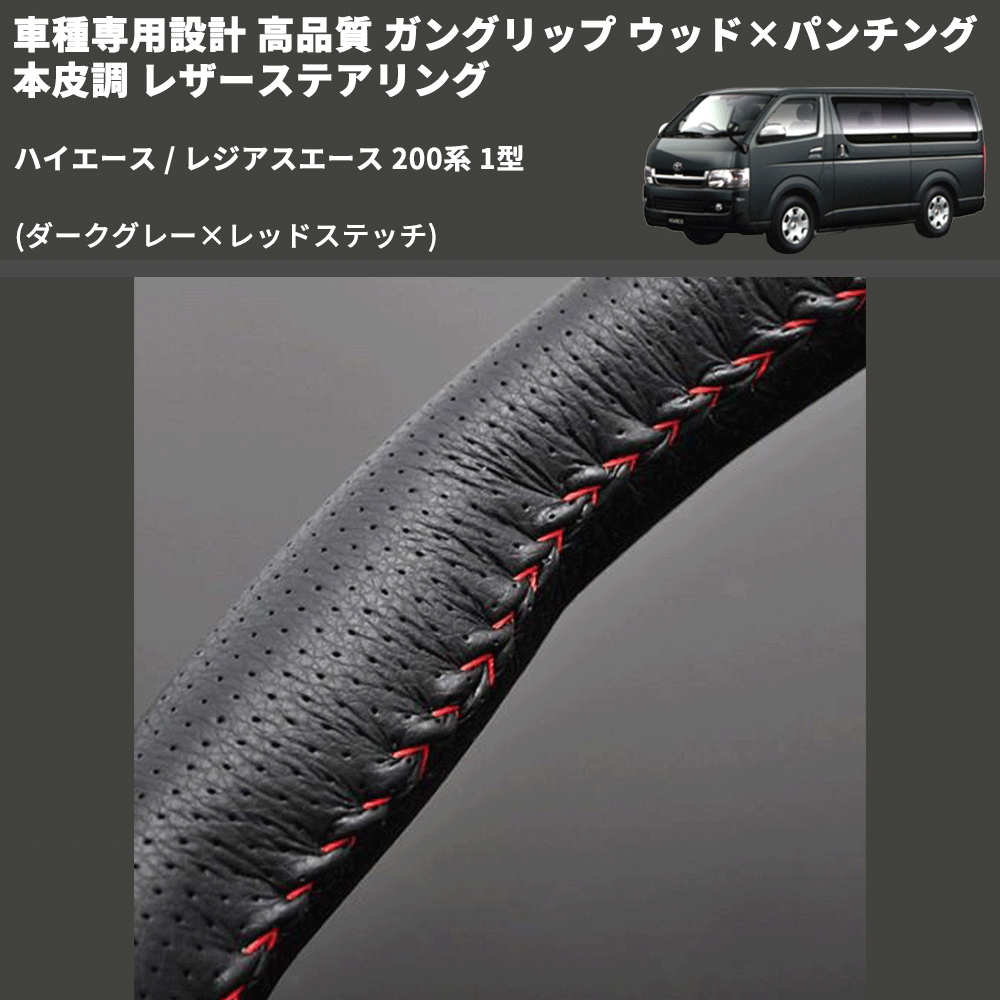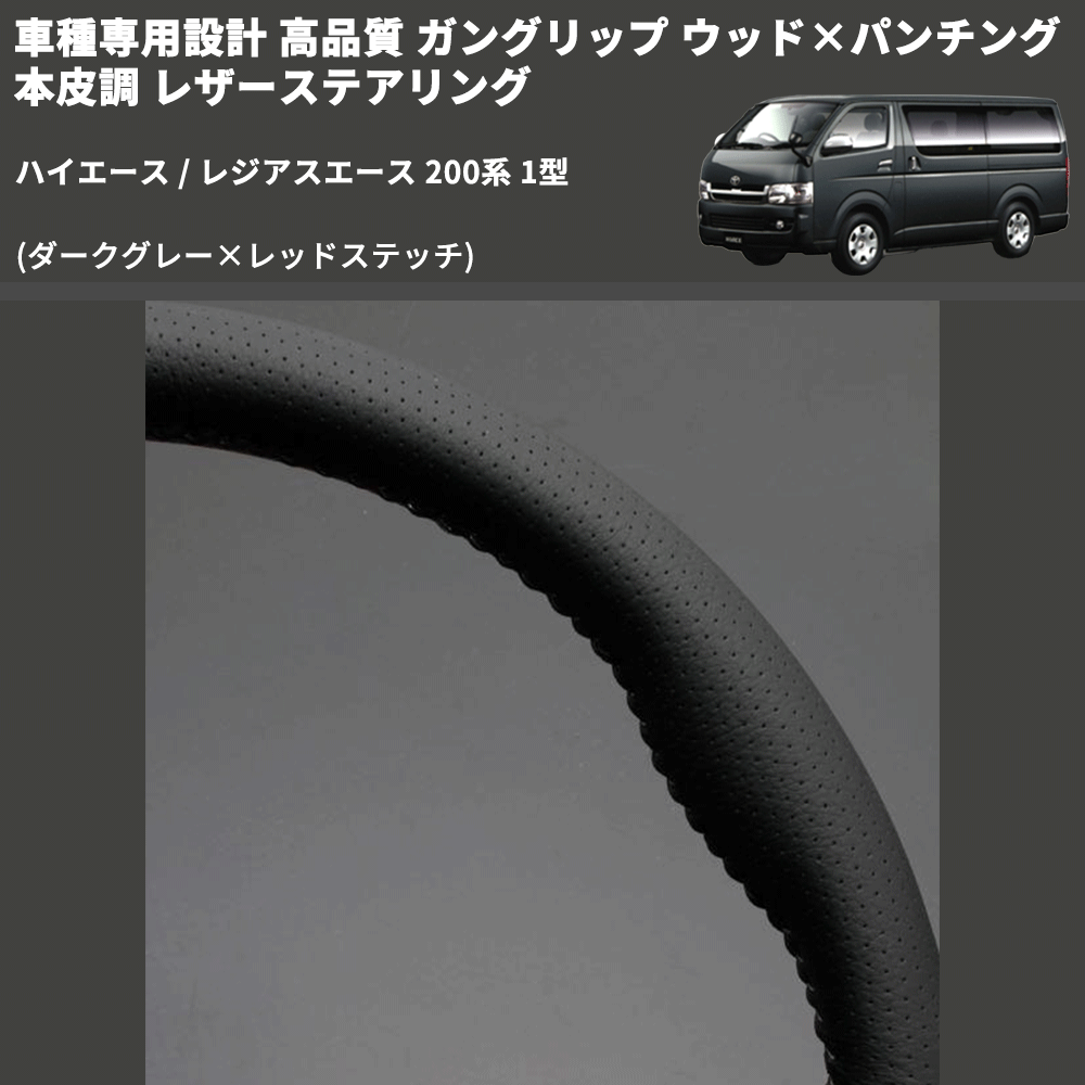 (ダークグレー×レッドステッチ) ガングリップ ウッド×パンチング 本皮調 レザーステアリング ハイエース / レジアスエース 200系 1型 FEGGARI LS116LR-001