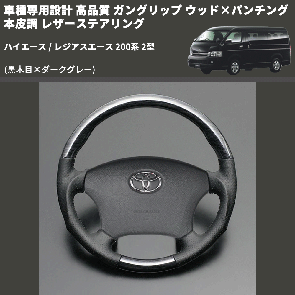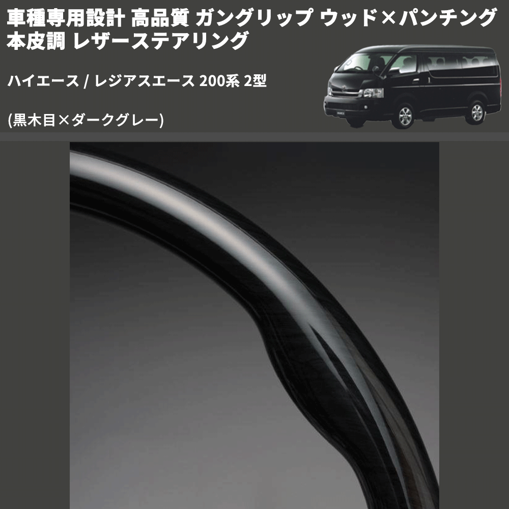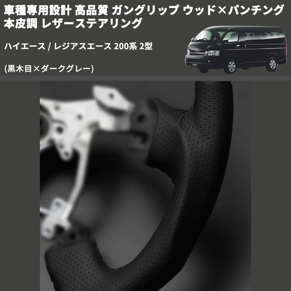 (黒木目×ダークグレー) ガングリップ ウッド×パンチング 本皮調 レザーステアリング ハイエース / レジアスエース 200系 2型 FEGGARI LS116-002 専用設計