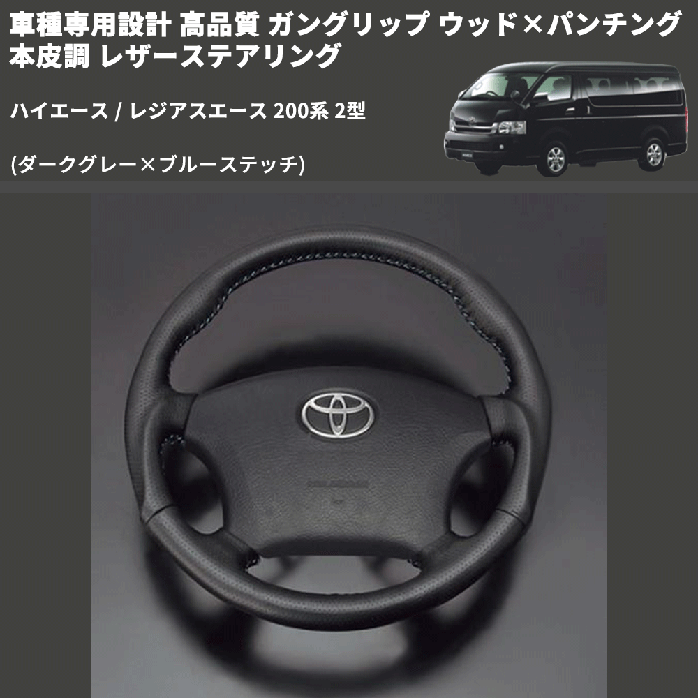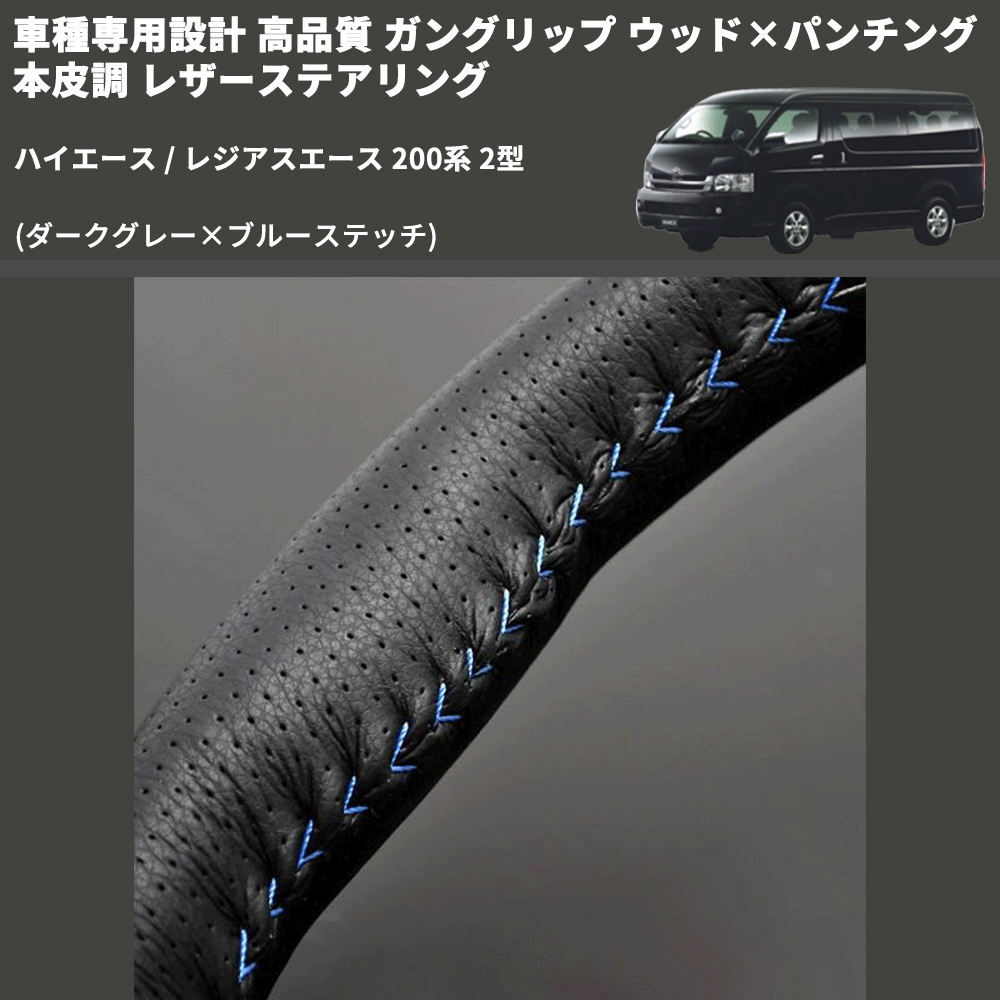 (ダークグレー×ブルーステッチ) ガングリップ ウッド×パンチング 本皮調 レザーステアリング ハイエース / レジアスエース 200系 2型 FEGGARI LS116LBL-002