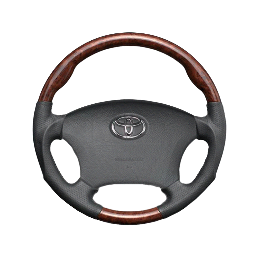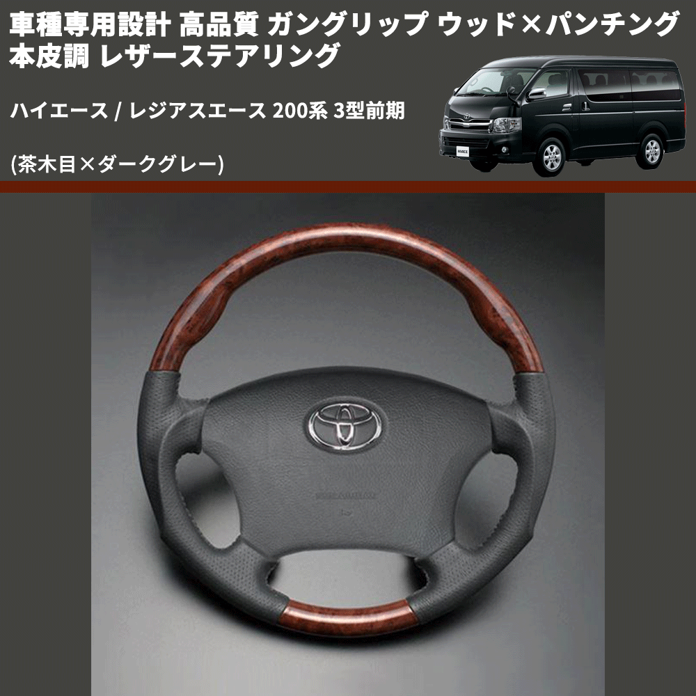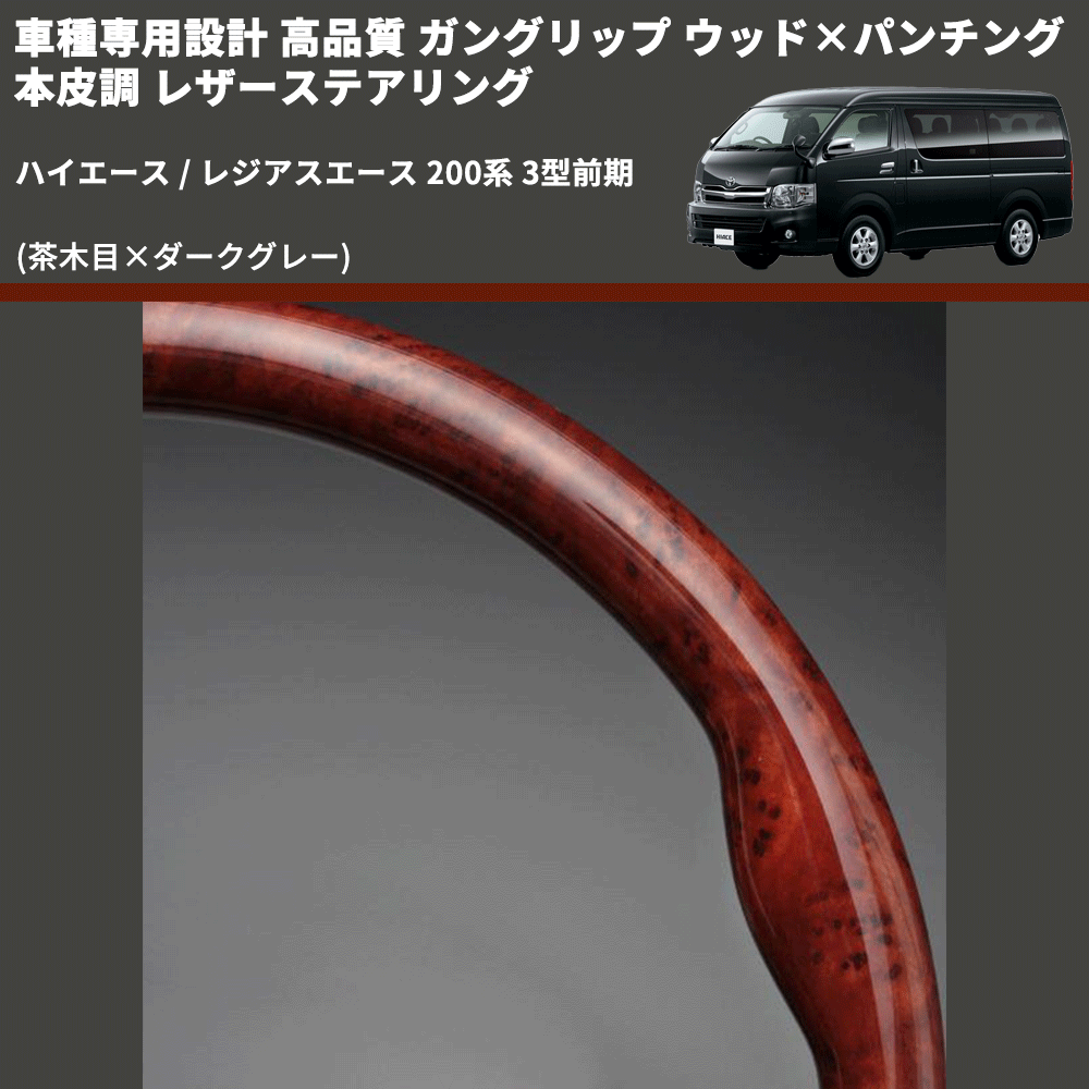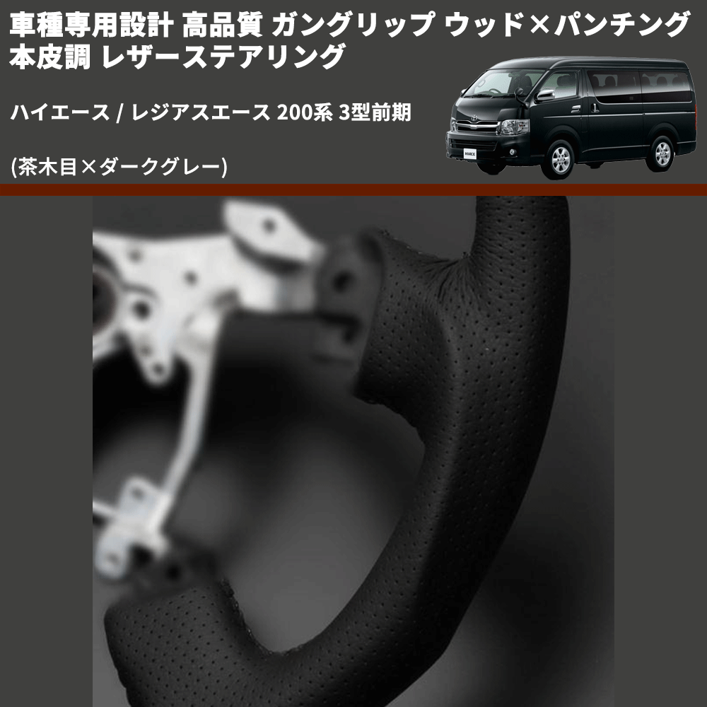 (茶木目×ダークグレー) ガングリップ ウッド×パンチング 本皮調 レザーステアリング ハイエース / レジアスエース 200系 3型前期 FEGGARI LS117-003