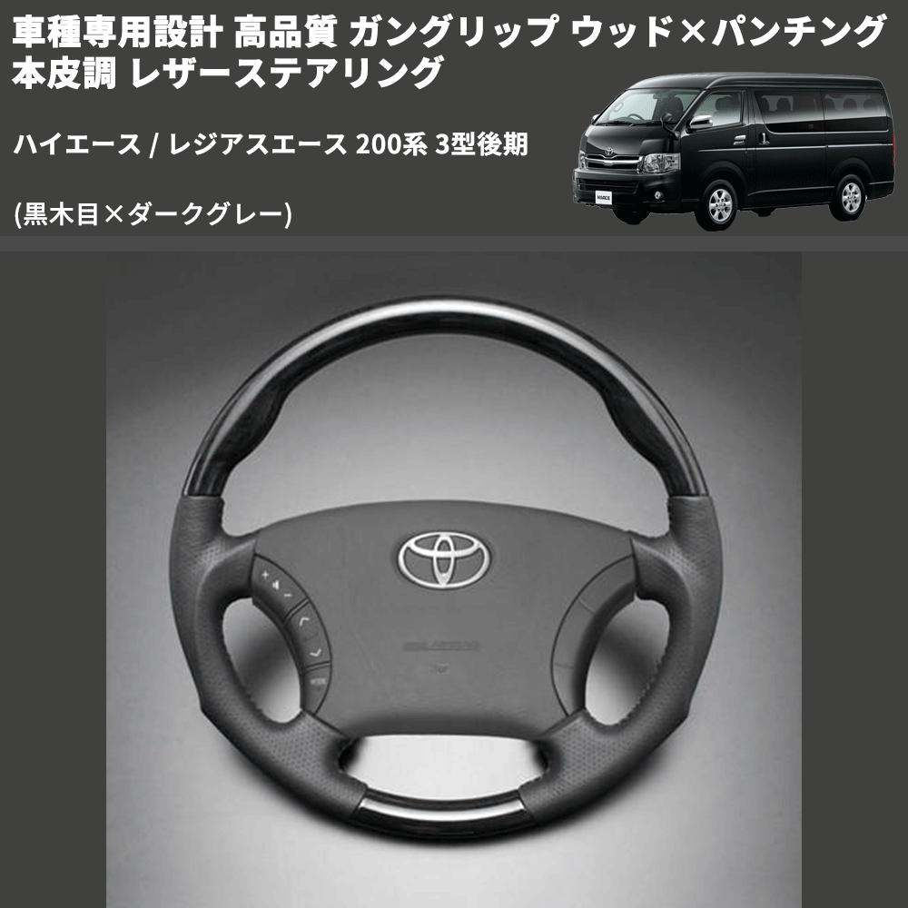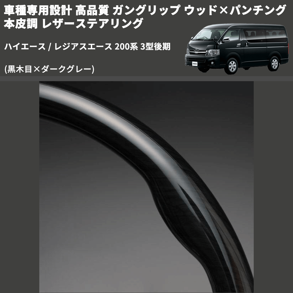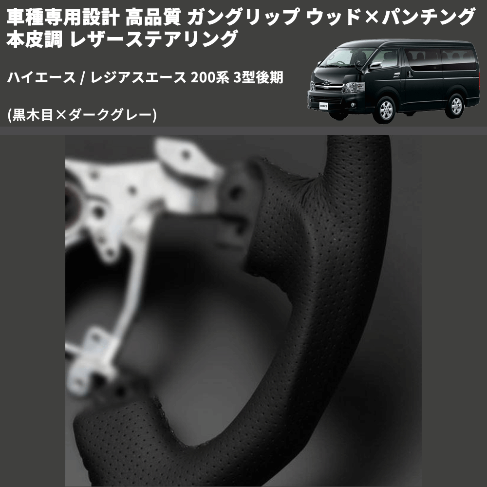(黒木目×ダークグレー) ガングリップ ウッド×パンチング 本皮調 レザーステアリング ハイエース / レジアスエース 200系 3型後期 FEGGARI LS116-008