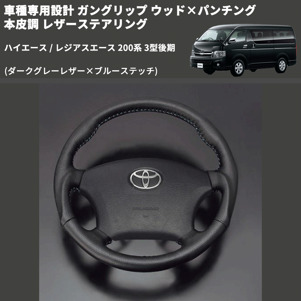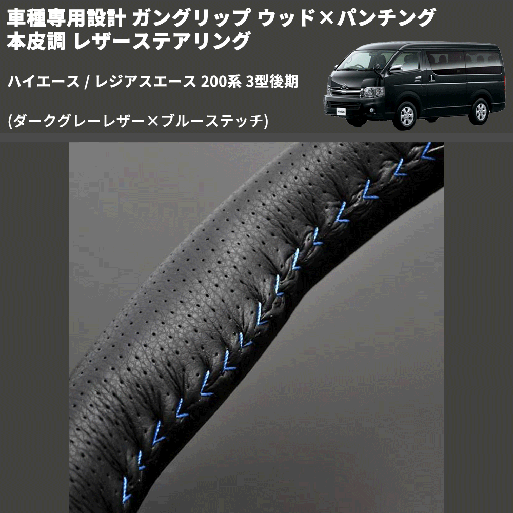 (ダークグレーレザー×ブルーステッチ) ガングリップ ウッド×パンチング 本皮調 レザーステアリング ハイエース 200系 3型後期 FEGGARI LS116LBL-008