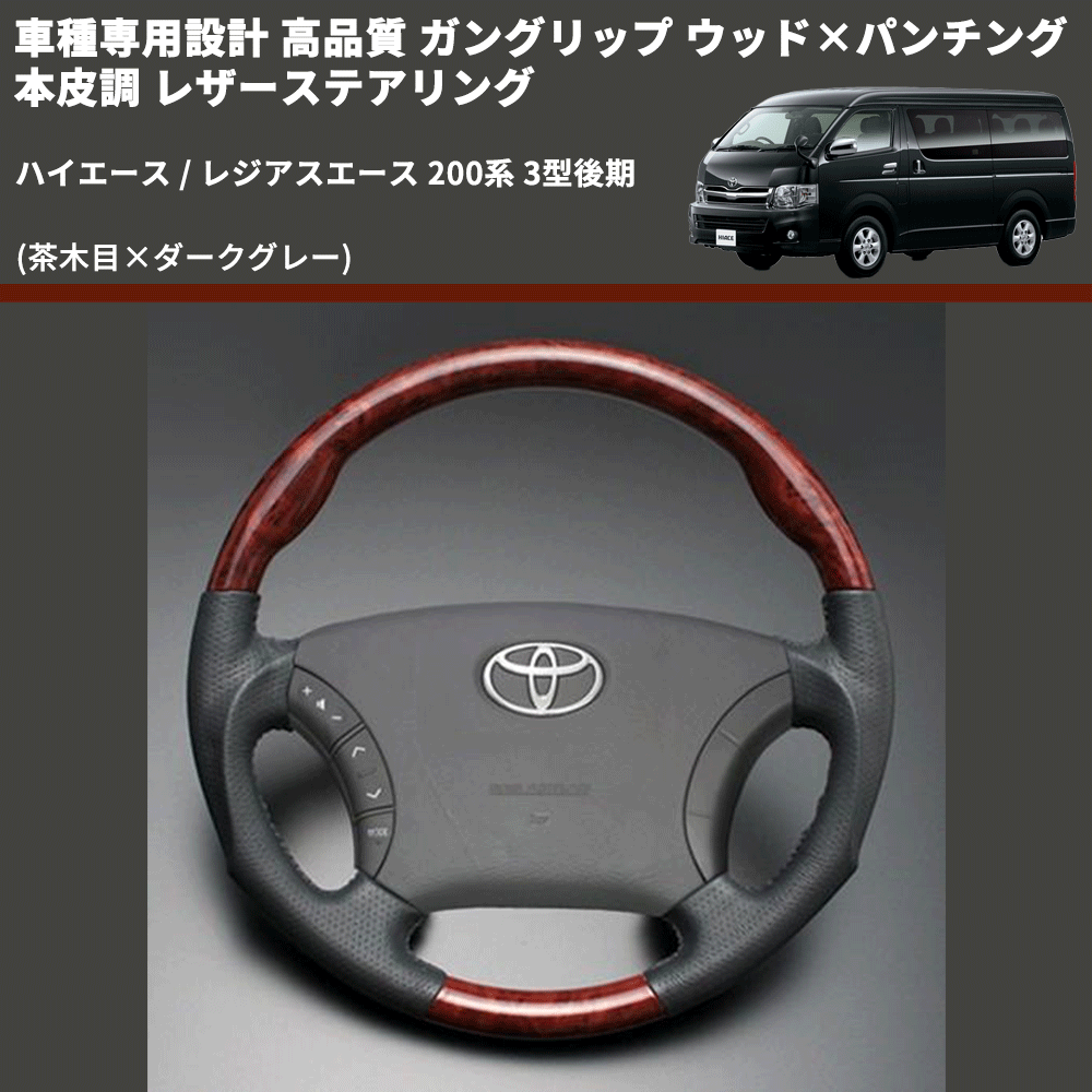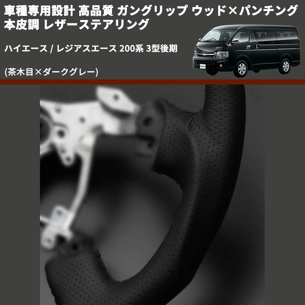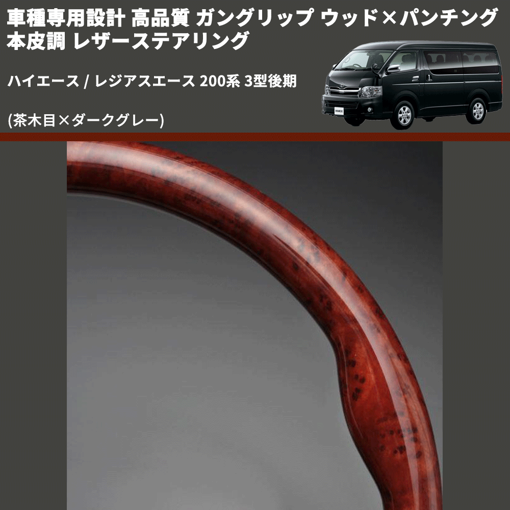 (茶木目×ダークグレー) ガングリップ ウッド×パンチング 本皮調 レザーステアリング ハイエース / レジアスエース 200系 3型後期 FEGGARI LS117-008