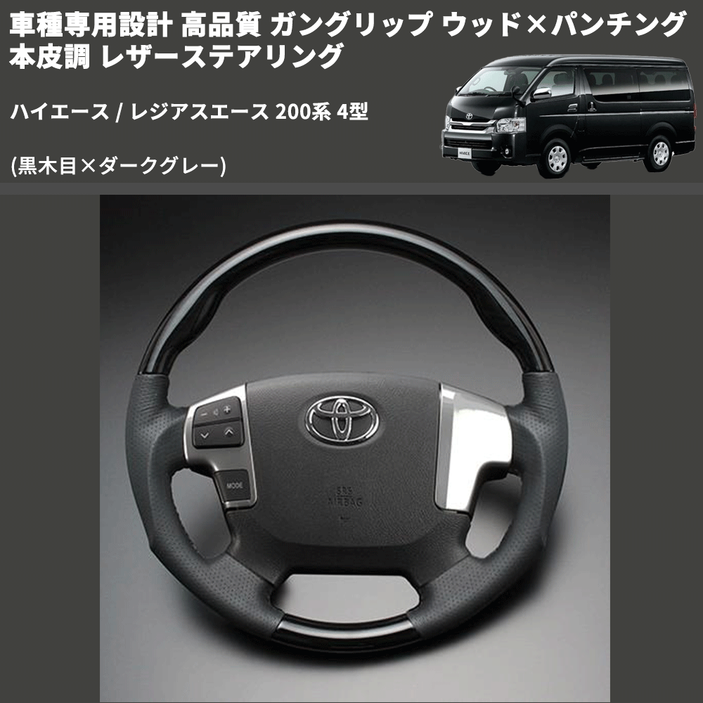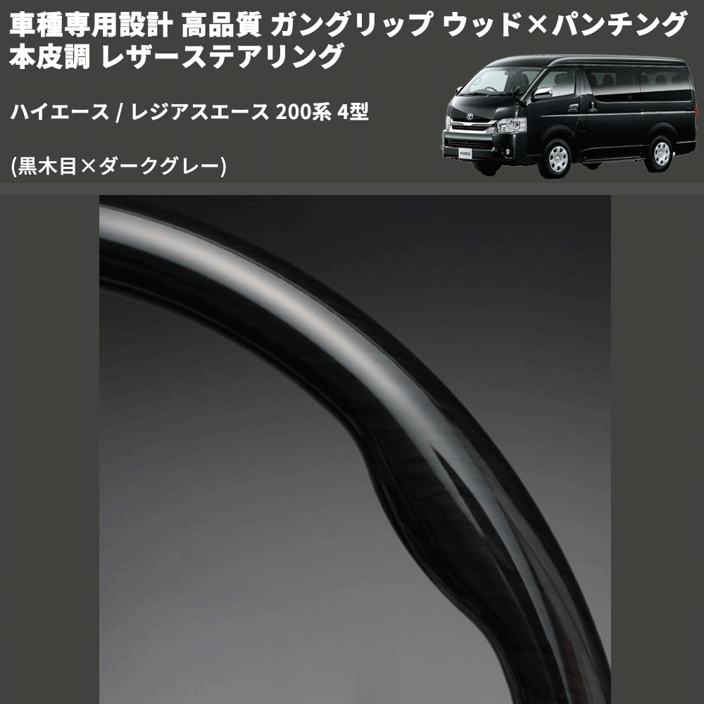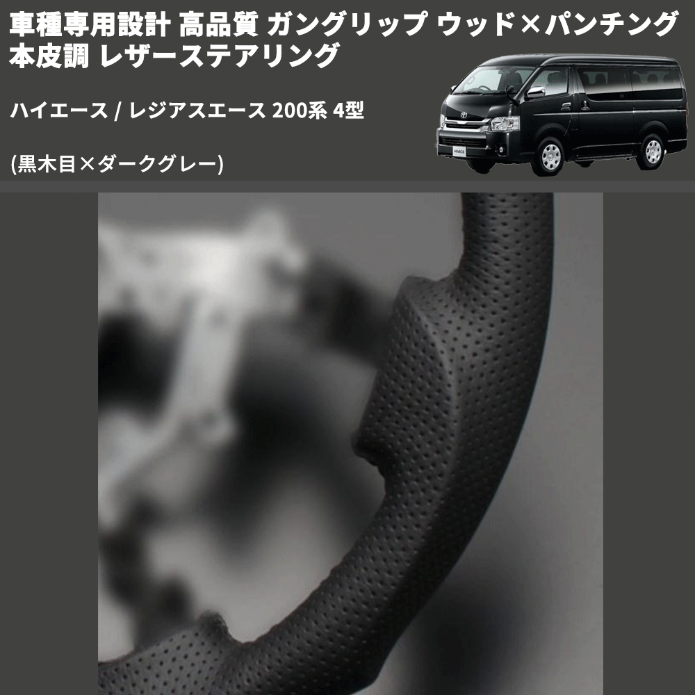 (黒木目×ダークグレー) ガングリップ ウッド×パンチング 本皮調 レザーステアリング ハイエース / レジアスエース 200系 4型 FEGGARI LS143-001 専用設計