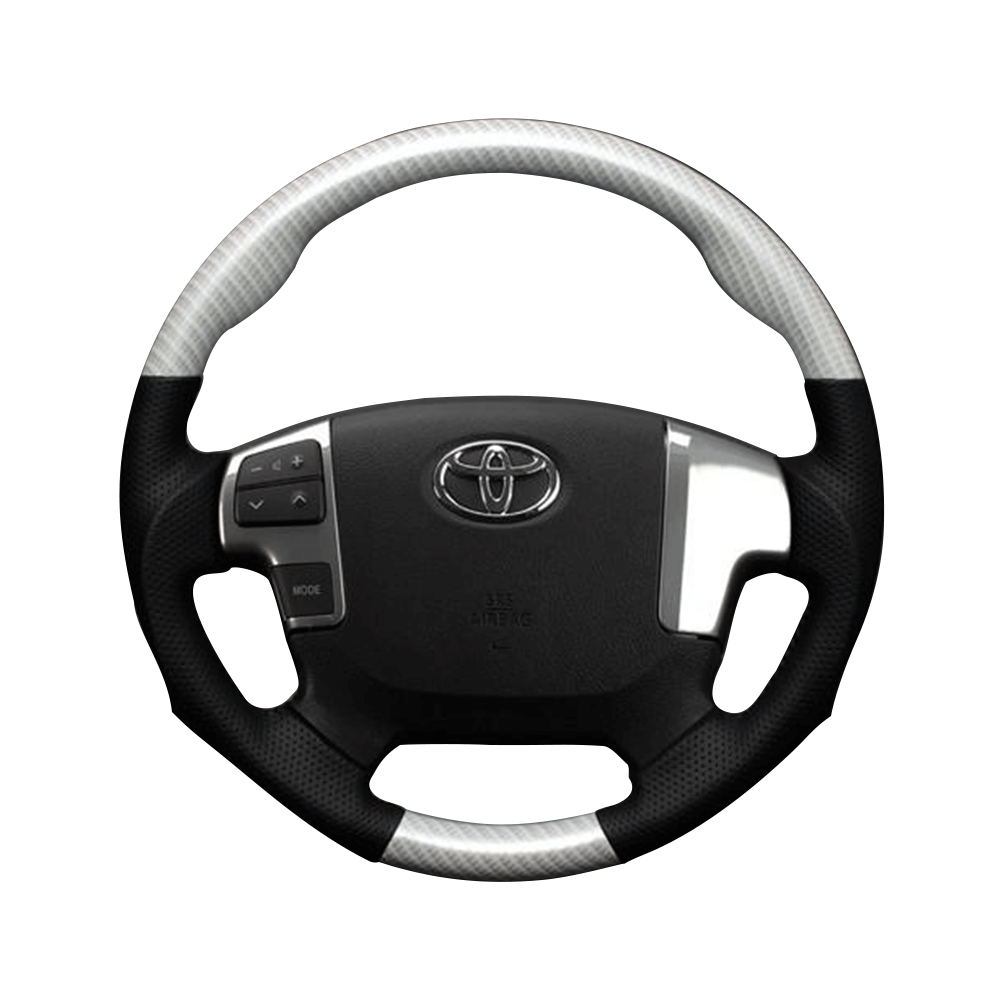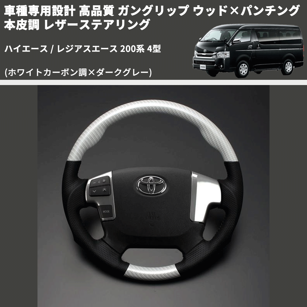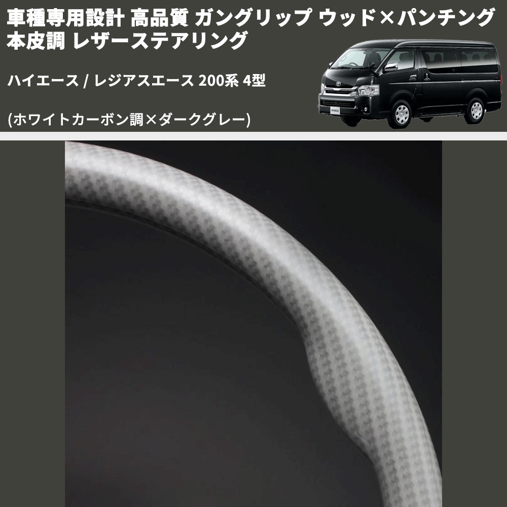 (ホワイトカーボン調×ダークグレー) ガングリップ ウッド×パンチング 本皮調 レザーステアリング ハイエース 200系 4型 FEGGARI LS143-257-001