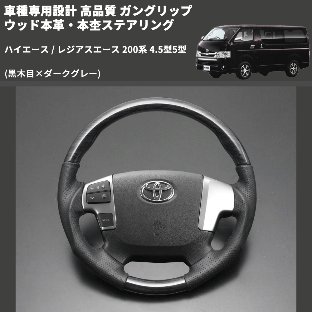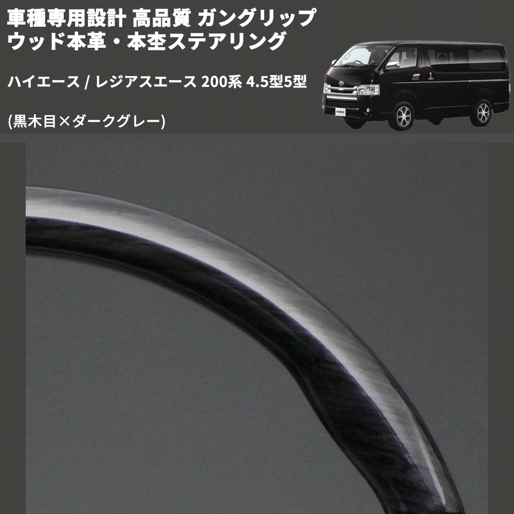 (黒木目×ダークグレー) ガングリップ ウッド本革・本杢ステアリング ハイエース / レジアスエース 200系 4.5型5型 FEGGARI LD003-002 専用設計 高品質