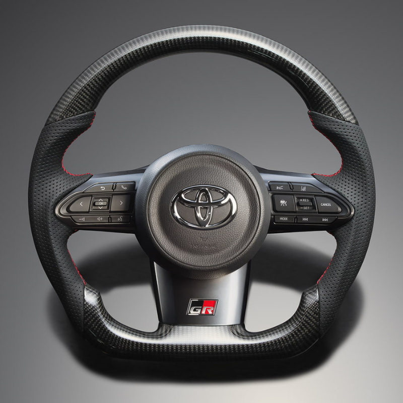 最上位モデル (艶ありリアルカーボン×本革グレー×レッドユーロステッチ) 純正交換ガングリップステアリング GRカローラ 10系 LS209 GR専用