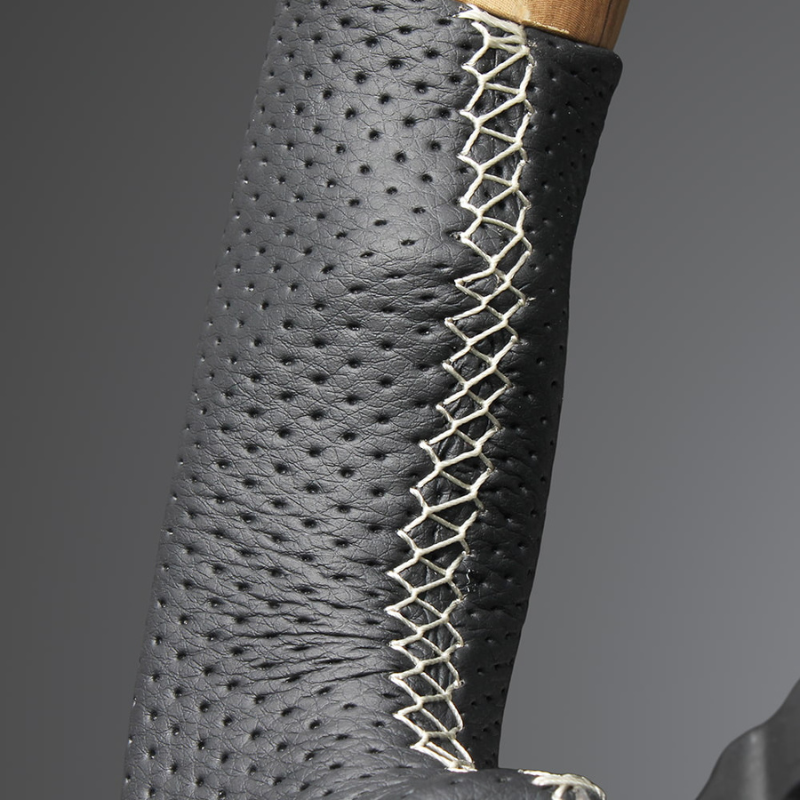 高品位PVCレザーを使用し、通気性を考慮したパンチング加工を施したグリップ部分はスポーツタイプ(ガングリップタイプ)で快適な操作性を実現。